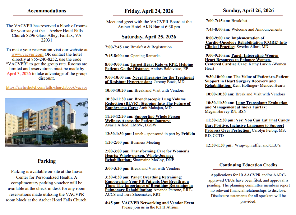 The 36th Annual VACVPR Conference will be held April 24-26, 2026, at the Inova Center for Personalized Health Conference Center, located on the Inova Fairfax Medical Campus. This year’s theme, “Whole Person, Whole Journey: Inclusive, Person-Centered Care,” will highlight innovative approaches to caring for patients as a whole individual and personalizing care within the cardiopulmonary setting.
